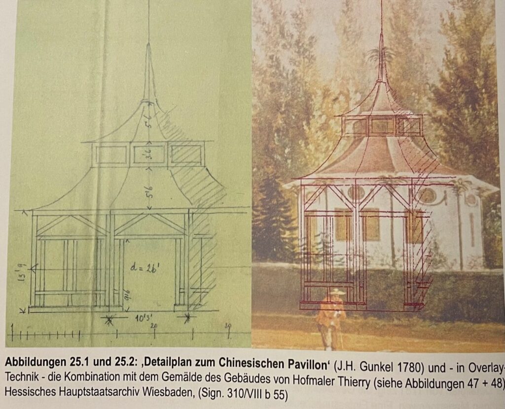 Der chinesische Pavillon ist eines der wenigen baulichen Elememente, die ausschließlich der ersten Gestaltungsphas des Kleinen Tannenwaldes entstammen. Hier der Plan von 1720: