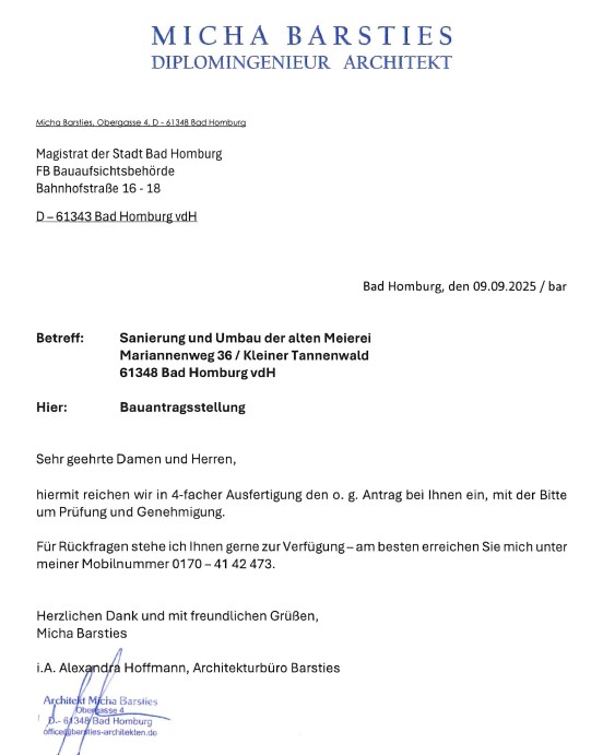 Der Bad Homburger Architekt Micha Barsties hat Pläne zur „Neuen Meierei“ vorgestellt auf deren Basis im Dezember 2022 eine Bauvoranfrage gestellt wurde zur Klärung aller wichtigen Eckdaten. Die Bauvoranfrage wurde im Januar 2024 in allen beantragten Punkten positiv beschieden. Wir hoffen noch in 2024 den Bauantrag stellen zu können. Vorbereitend hierfür sind eine Bestandsanalyse zusammen mit dem Denkmalschutz, eine Untersuchung der Statik, Gutachten zu Biotopwert, Artenschutz und umliegender Bepflanzung etc.. in Arbeit. Parallel dazu wird an einem Betreiberkonzept für die zukünftige Nutzung gearbeitet.